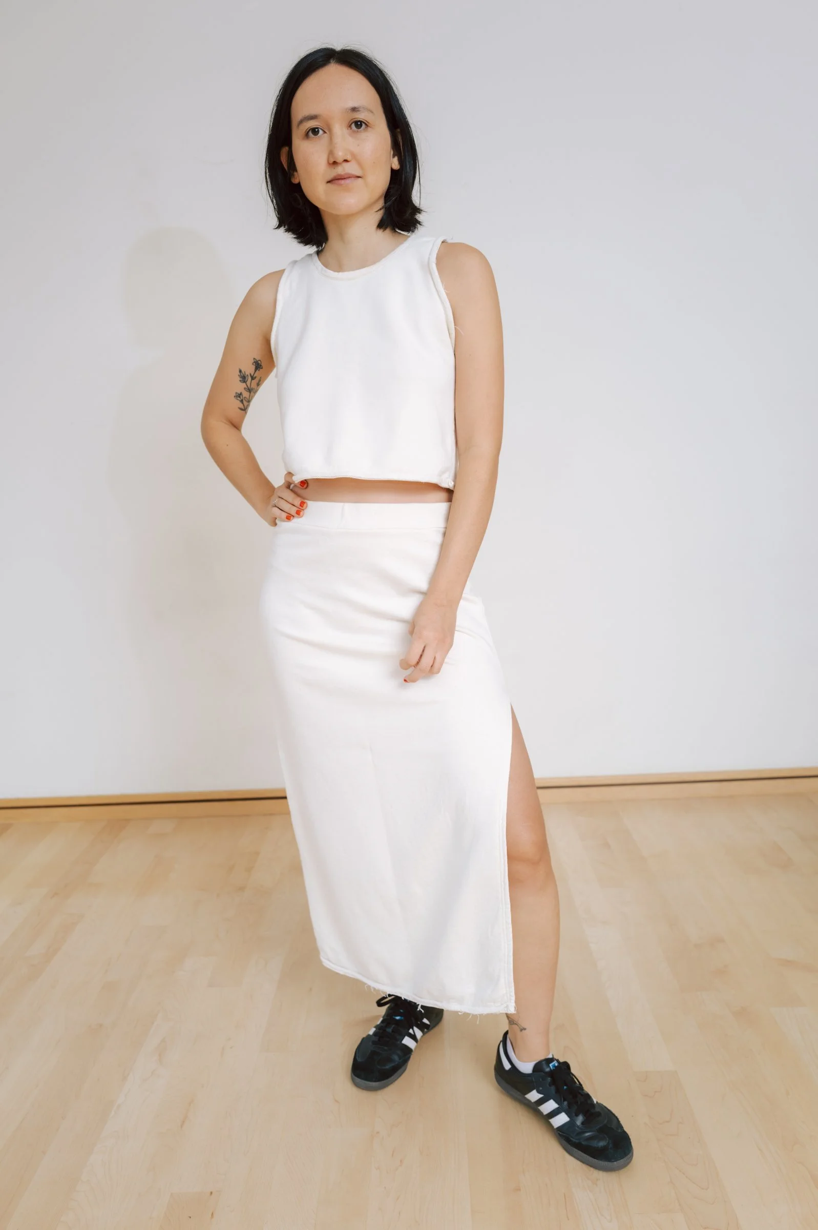 The Fibershed Rooted in Simplicity event focused on the meaning and power of what we wear and how we care for those textiles over time. The Student Designer Challenge was to create a garment which is completely biodegradable. This look is comprised of locally grown* 100% cotton terry and cotton thread. The fabric received no color treatments and has been left in its undyed, natural state.